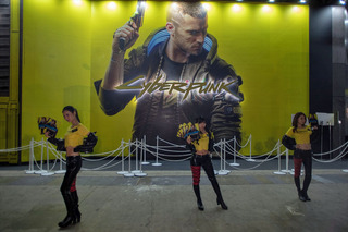 俳優のキアヌ・リーヴスがゲーム中に登場することで話題の「cyberpunk 2077」の紹介ブース。